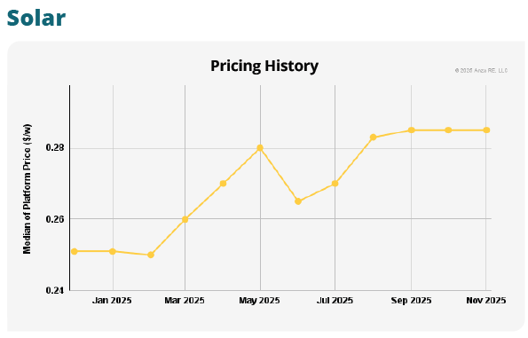 Overall solar module median pricing in the U.S. increased by 14% or $0.035/W from January to November, according to Anza Renewables’ Q4 2025 Quarterly Pricing & Domestic Content Report. The report highlighted that rapid and monumental policy changes drove the rise in module prices.