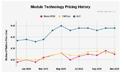 In November, the median pricing was $0.275/W for Mono PERC, $0.285/W for TOPCon, and $0.39/W for HJT.