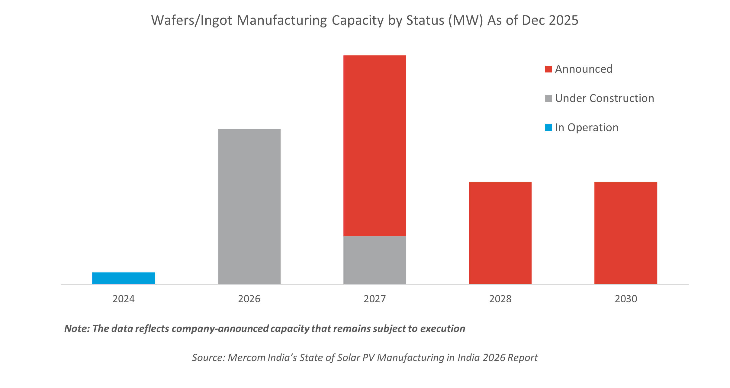 According to Mercom Research, India had roughly 2 GW of wafer manufacturing capacity, compared with about 210 GW of module capacity and 27 GW of cell capacity as of December 2025, highlighting the scale of the upstream gap the new policy seeks to address.