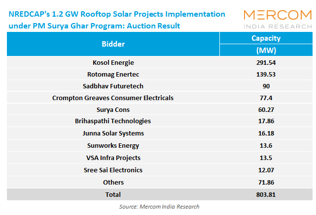 Kosol Energie, Rotomag Enertec, Sadbhav Futuretech, Crompton Greaves Consumer Electricals, and Surya Cons have won capacities of 291.54 MW, 139.53 MW, 90 MW, 77.4 MW, and 60.27 MW, respectively.