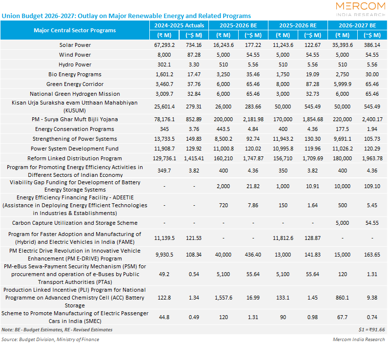 The proposed spending on the crucial Green Energy Corridor (GEC) program for interstate power transmission has remained the same. The allocation for GEC in FY 2026-27 is ₹5.99 billion (~$65.33 million), compared with the Budget allocation of ₹6 billion (~$65.44 million) in FY 2025-26 and the revised estimate of ₹8 billion (~$87.25 million).