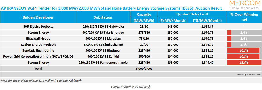 SVR Electro Projects won 25 MW at a tariff of ₹148,000 (~$1,654.37)/MW/month for the project at Gajuwaka substation.