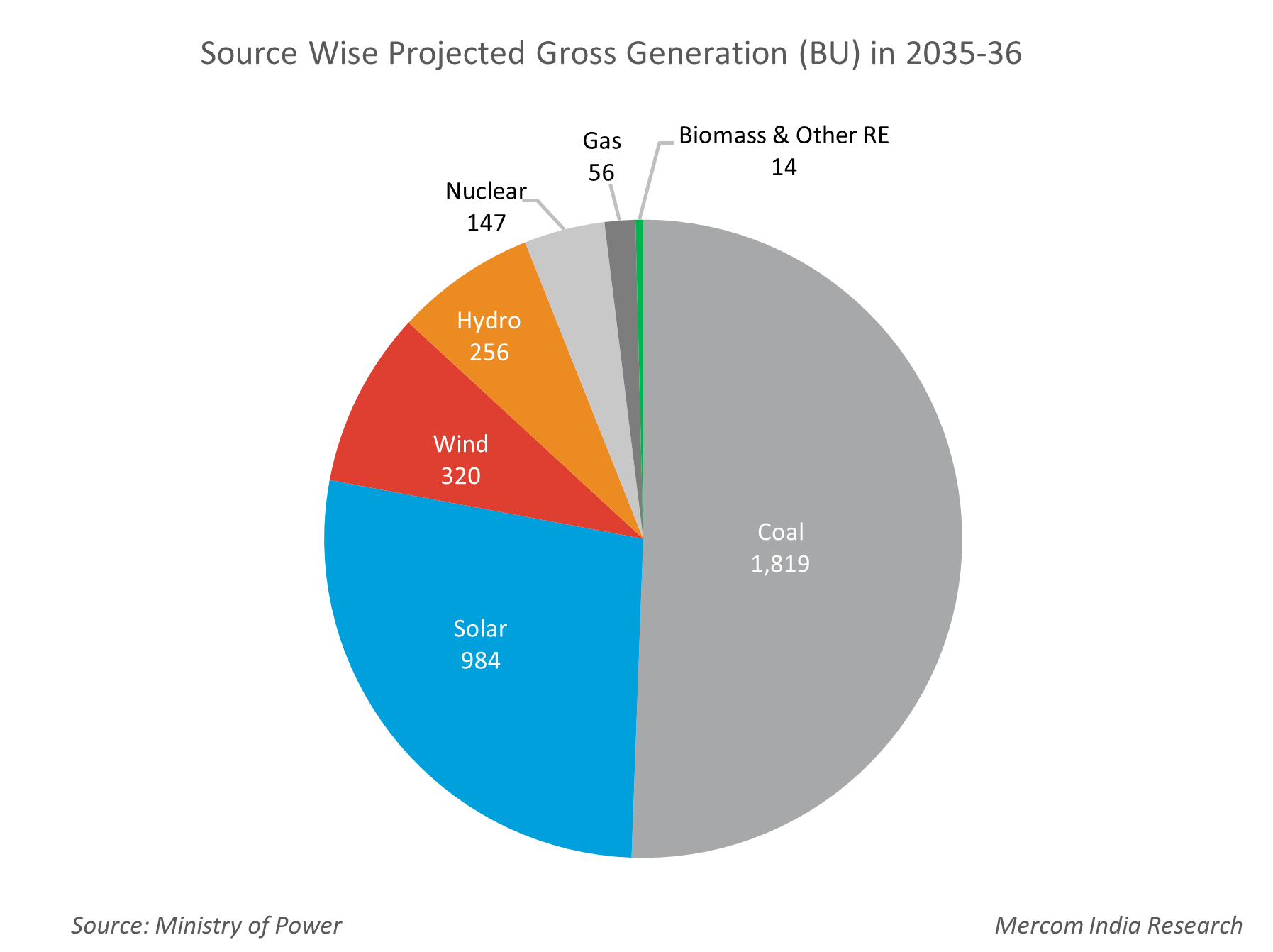 However, the report notes that coal will remain the largest electricity producer in 2035-36. Coal is expected to generate 1,819 BU, 51% of the gross generation of 3,596 BU. Solar power will generate 984 BU at 27%, wind 320 BU at 9%, hydroelectricity 256 BU at 7%, nuclear power 147 BU at 4%, and gas 56 BU at 2%.