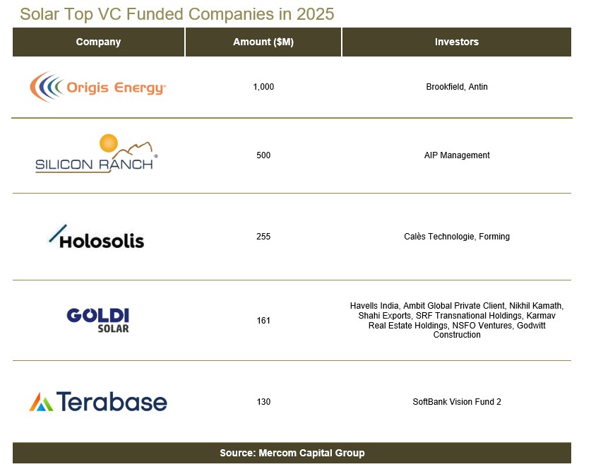 The top VC-funded companies in 2025 were Origis Energy ($1 billion), Silicon Ranch ($500 million), HoloSolis ($255 million), Goldi Solar ($161 million), and Terabase Energy ($130 million).