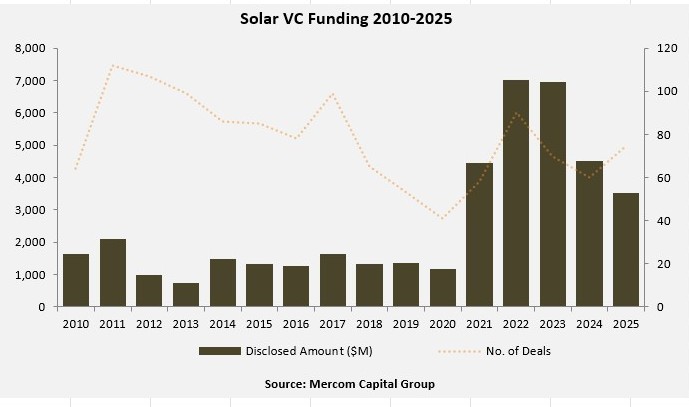 Of the $3.5 billion raised in VC funding in 75 deals in 2025, $2.7 billion (77%) went to solar downstream companies.