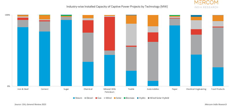According to CEA data, while steam-based captive power continues to dominate, there is clear, accelerating integration of solar, wind, and hybrid capacities.