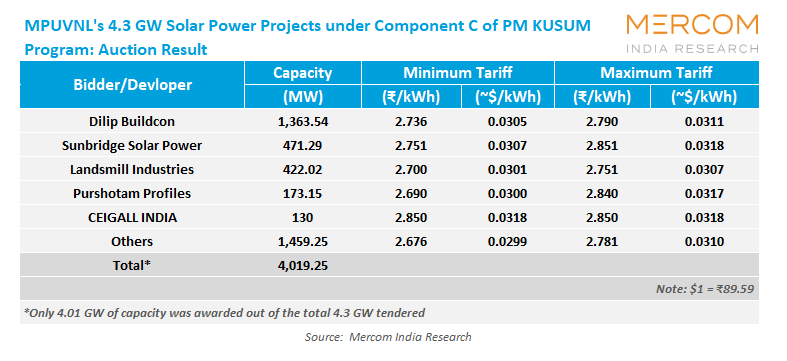 Only 4.01 GW capacity was awarded out of the total 4.3 GW tendered capacity.
