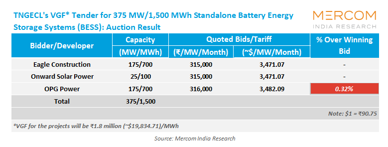 OPG Power won 175 MW/700 MWh at a tariff of ₹316,000 (~$3,482.09)/MW/month.