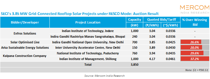 Kalpana Construction was awarded the development of a 760 kW project at the National Institute of Technology in Puducherry at a tariff of ₹3.94 (~$0.0435)/kWh. It also secured a 1,000 kW project at the Indian Institute of Management, Shillong, quoting ₹4.17 (~$0.0461)/kWh.