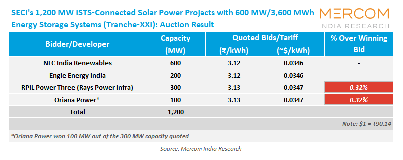 Oriana Power quoted 300 MW to win 100 MW under the bucket-filling method at a tariff of ₹3.13 (~$0.0347)/kWh.