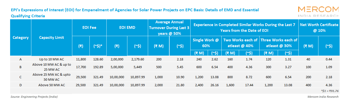 Engineering Projects India (EPI) has invited expressions of interest to empanel experienced agencies as joint venture, consortium, associate, or back-end partners for upcoming solar engineering, procurement, and construction (EPC) projects across India.