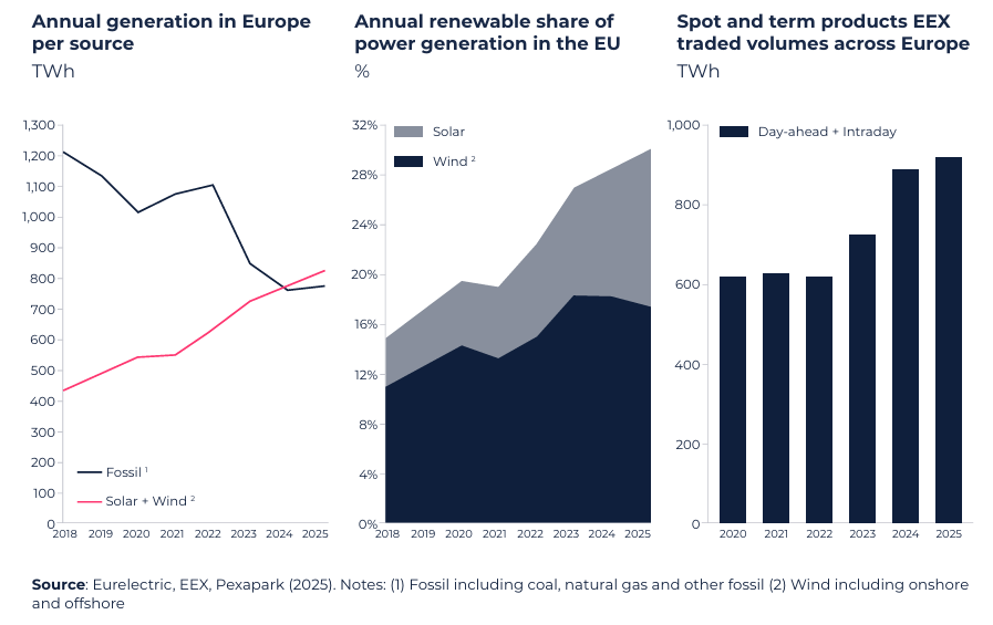 Solar and wind together contributed around 30% of total generation, overtaking fossil fuels and nuclear as the single largest technology block. This transition has not resulted in stable low prices but in what the report terms a “Big Repricing,” where headline prices matter less than capture rates, volatility exposure, and risk-adjusted revenues.
