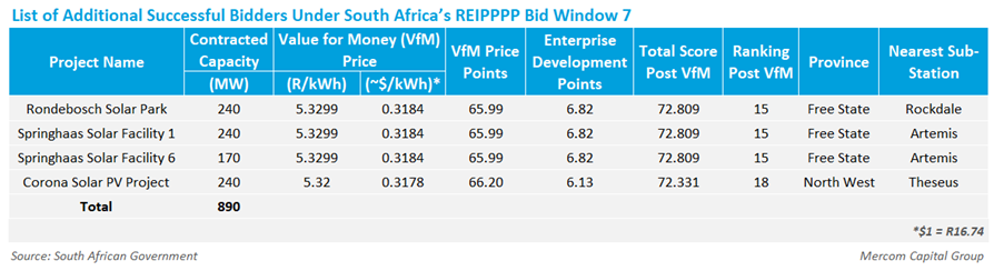 The Rondebosch Solar Park and Springhaas Solar Facility 1 secured a capacity of 240 MW each, while Springhaas Solar Facility 6 secured 170 MW, with a value-for-money (VfM) price of ZAR532,990 (~$31,802.83)/MWh each. These projects are in the Free State province.