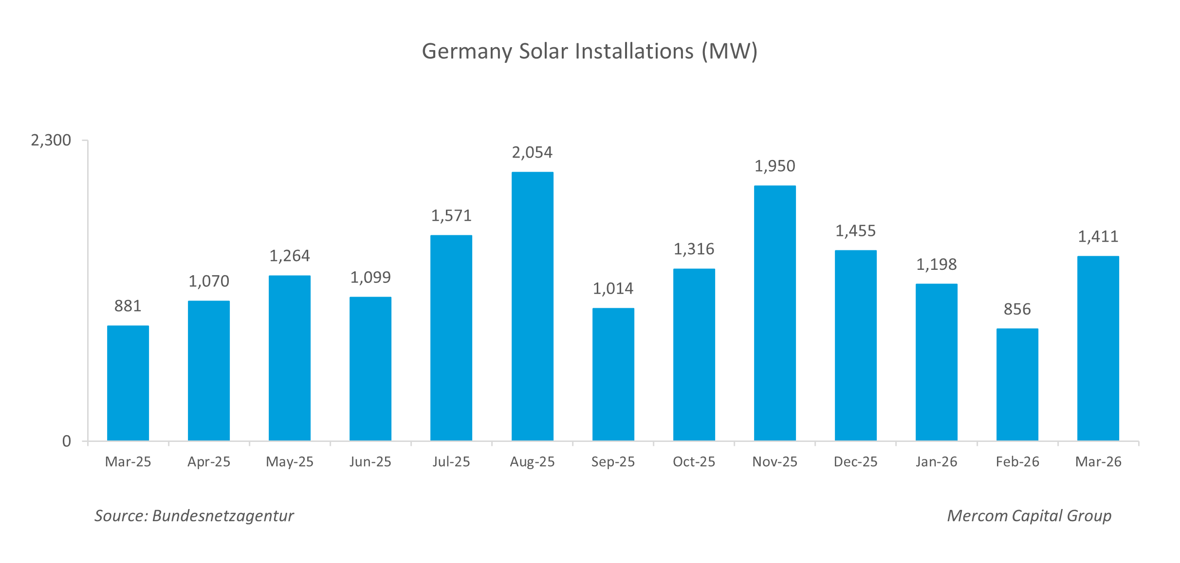 In March 2026, the country added 1.4 GW of solar capacity. The additions include 1,227 MW of registered capacity and an estimated 15% more installations due to delayed registrations.
