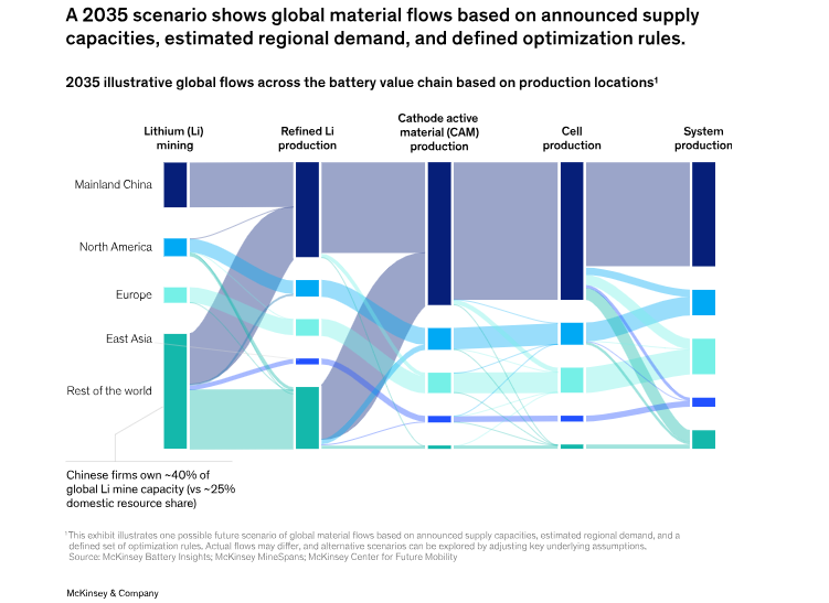 In Europe, the Green Deal Industrial Plan and the Critical Raw Materials Act aim to ensure that by 2030 at least 40% of clean-technology needs are met domestically. To achieve global competitiveness, Europe will need to invest an estimated €300 billion (~$348.66 billion) by 2035 across the full battery value chain.