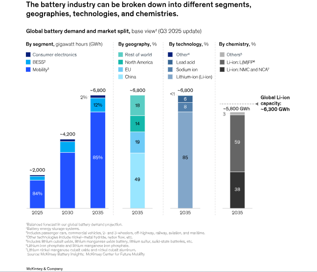 Looking ahead, the global battery market is expected to grow to about 4.2 TWh by 2030 and 6.8 TWh by 2035, with Li-ion technologies accounting for more than 85% of demand.