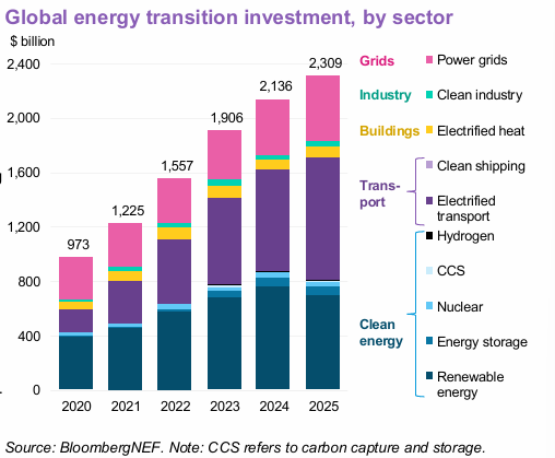 Global Energy Transition Investments Rise to $2.3 Trillion in 2025: BNEF Report