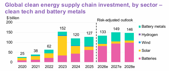 Clean energy supply chain investments, which include spending on new clean-tech product factories and battery metal production assets, grew 6% to $127 billion in 2025. Factory investment dipped slightly, while spending on battery metals rose slightly.