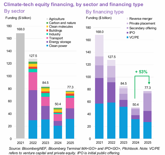 Climate-tech companies raised $77.3 billion in private and public equity in 2025, up 53% YoY, marking the first year of growth after three consecutive years of decline.