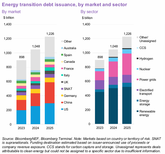 In 2025, $1.2 trillion in debt was issued for energy transition, up 17% YoY.