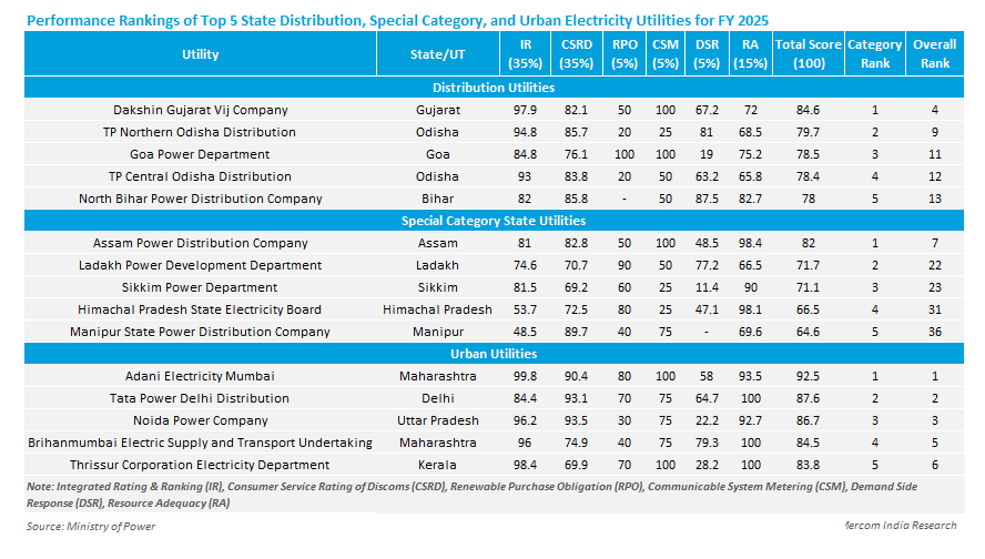 Among special category state utilities, Assam Power Distribution Company, Ladakh Power Development Department, Sikkim Power Department, and Himachal Pradesh State Electricity Board were the top performers.