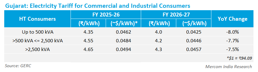 For Torrent Power consumers in Ahmedabad, Gandhinagar, and Surat, it introduced a ₹0.3 (~$0.0032)/kWh solar-hours rebate for High Tension Maximum Demand (HTMD)-I, HTMD-II, and HTMD-Metro Traction categories. It also revised the peak-hour time-of-use charge slots to 06:00–08:00 and 17:00–23:00.