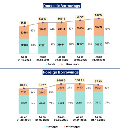 IREDA had outstanding borrowings of ₹731.92 billion (~$8.12 billion) as of December 31, 2025. Domestic borrowings constituted 87% of the total outstanding borrowings, while foreign borrowings made up the remaining 13%.