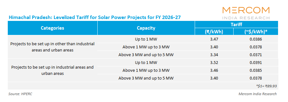 For FY 2026, HPERC approved a levelized tariff of ₹3.45 (~$0.04)/kWh for solar projects up to 1 MW and ₹3.38 (~$0.039)/kWh for projects between 1 MW and 3 MW. The Commission fixed the levelized tariff for projects between 3 MW and 5 MW at ₹3.32 (~$0.39)/kWh for areas other than urban and industrial zones.