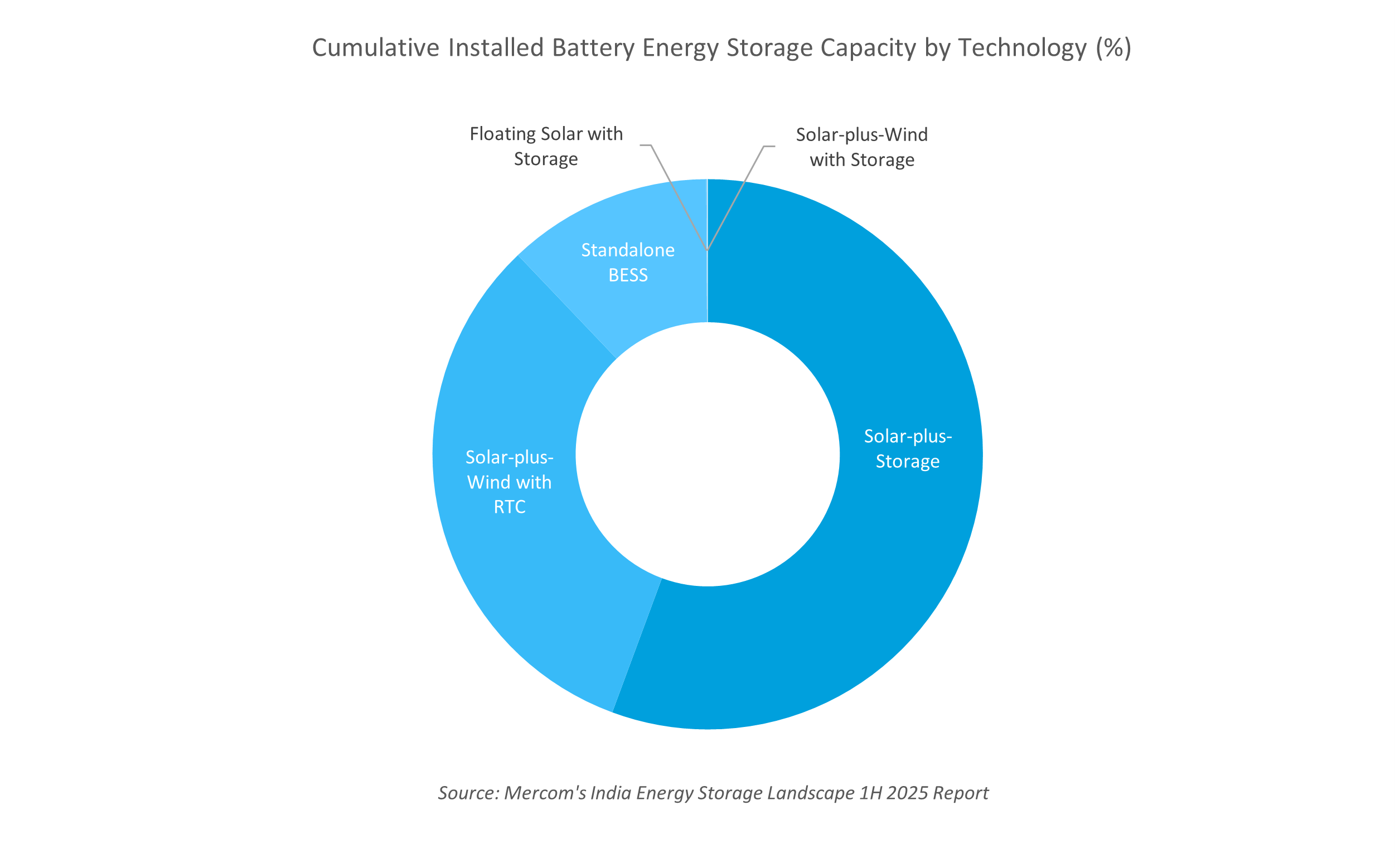 Solar-plus-storage systems accounted for nearly 56% of India’s cumulative installed capacity. This was followed by more than 32% from solar-plus-wind projects with round-the-clock capability, and over 12% from standalone battery energy storage systems. The remaining share came from floating solar with storage, and solar-plus-wind projects with storage capabilities.