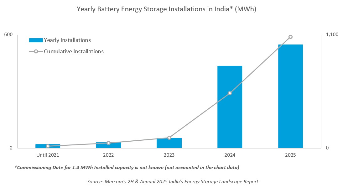 India added nearly 547 MWh of battery energy storage capacity in 2025, around 26% year-over-year (YoY) increase from over 433 MWh, according to the newly released 2H & Annual 2025 India’s Energy Storage Landscape Report by Mercom India Research.