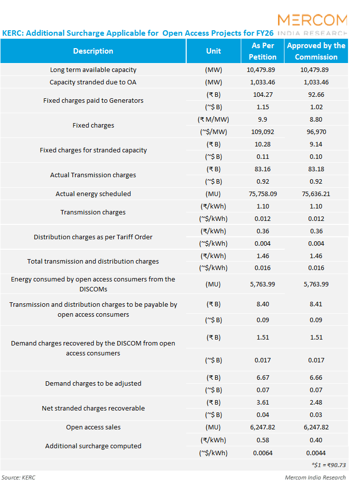 KERC approved an additional surcharge of ₹0.4 (~$0.004)/kWh for FY 2026 and directed the DISCOM to file a petition to revise the additional surcharge for the next financial year from July 1, 2026.