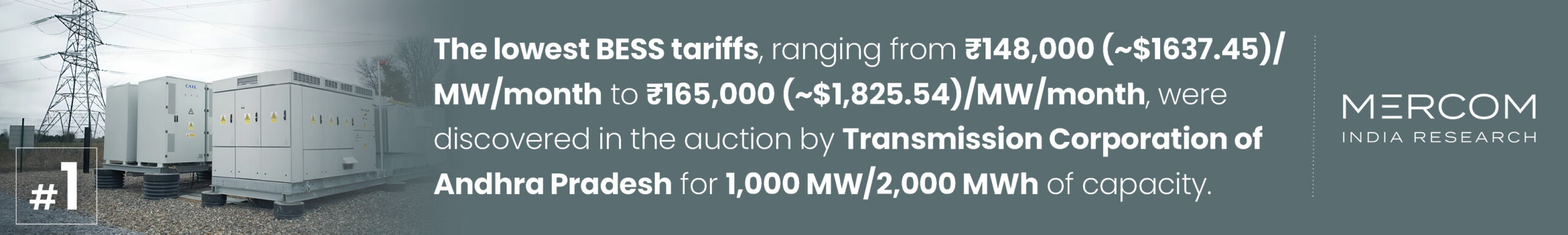 #1 The lowest BESS tariffs, ranging from ₹148,000 (~$1637.45)/MW/month to ₹165,000 (~$1,825.54)/MW/month, were discovered in the auction by Transmission Corporation of Andhra Pradesh for 1,000 MW/2,000 MWh of capacity. The winning companies were SVR Electro Projects, Ecoren Energy, Bhagwati Group, Legion Energy Products, Bondada Engineering, Power Grid Corporation of India, and Ecoren Energy.