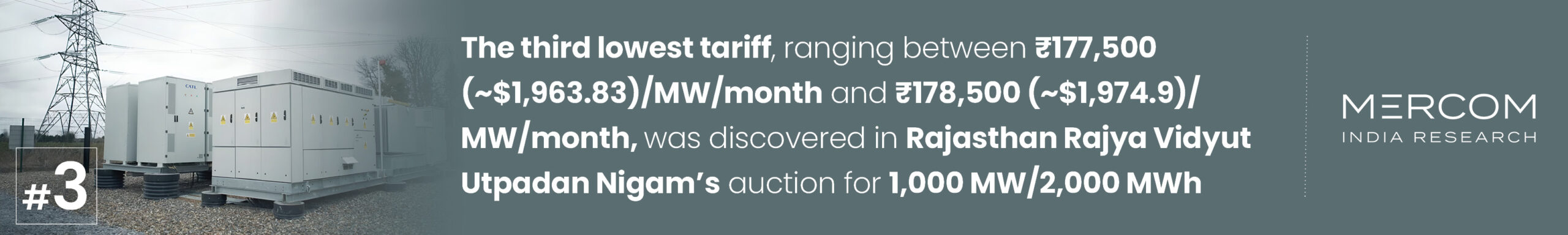 #3 The third lowest tariff, ranging between ₹177,500 (~$1,963.83)/MW/month and ₹178,500 (~$1,974.9)/MW/month, was discovered in Rajasthan Rajya Vidyut Utpadan Nigam’s auction for 1,000 MW/2,000 MWh BESS. The winners were Stockwell Solar Services, Oswal Cables, Patanjali Renewables, Micromax Informatics, RCVS Innovations, Viviana Power Tech, Galaxy Mining and Royalites, Manda Projects, Minerallia Projects, Onward Solar Power, and S T Electricals.