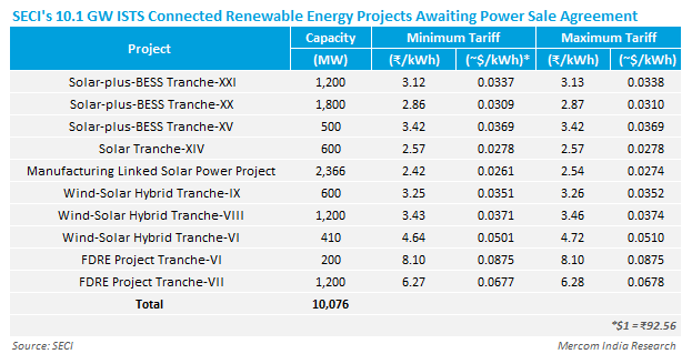 Across all categories, tariffs have been determined through competitive bidding, with SECI’s trading margin of ₹0.07 (~$0.0007)/kWh applied to the discovered tariff.