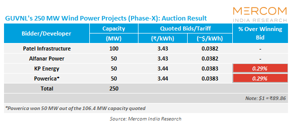 Patel Infrastructure, Alfanar Power, KP Energy, and Powerica won Gujarat Urja Vikas Nigam’s (GUVNL) auction to set up 250 MW grid-connected wind power projects (Phase X).