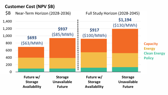 The report also finds that customer costs would be about 30% higher between 2028 and 2045 if storage is not available. The calculation excludes transmission and distribution impacts, which currently amount to under $50 billion per year in PJM.