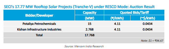 Potaliya Petrochemicals won 15 MW, and Kishan Infrastructure Industries won 2.768 MW at a tariff of ₹4.11 (~$0.0434)/kWh.