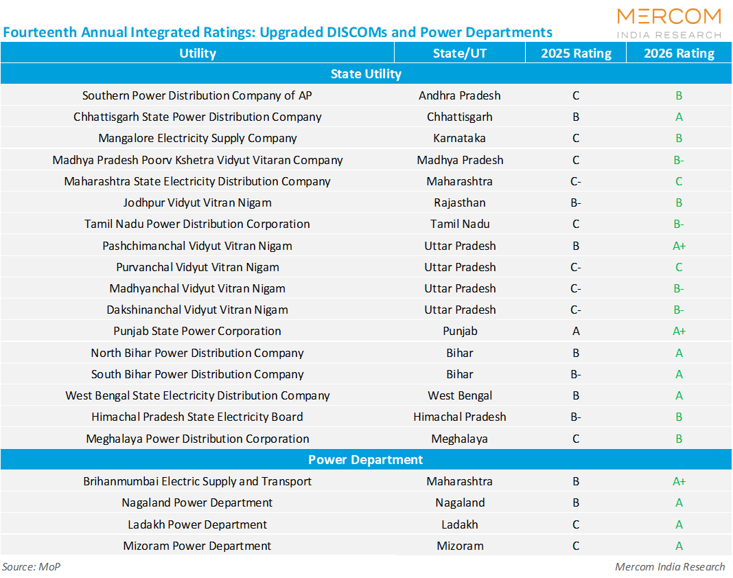 Of the 14 rated utilities, 31 power distribution utilities across the broader assessment framework received A+ or A grades, while 11 utilities were rated C or C-. Grades were upgraded for 22 utilities comprising 18 DISCOMs and four power departments, while 10 utilities saw downgrades, including nine DISCOMs and one power department.