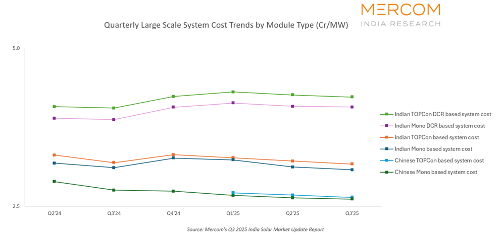 These findings are from Mercom’s Q3 2025 India Solar Market Update, a 120-page report that provides an in-depth assessment of India’s solar sector, covering project costs and installations, supply-chain trends, policy developments, and market forecasts.