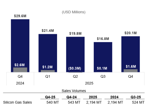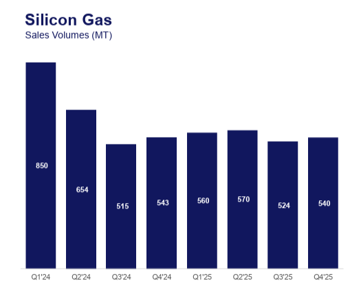 Silicon gas sales volumes increased by 16 MT to 540 MT during Q4 of 2025 compared to the previous quarter of the same year.