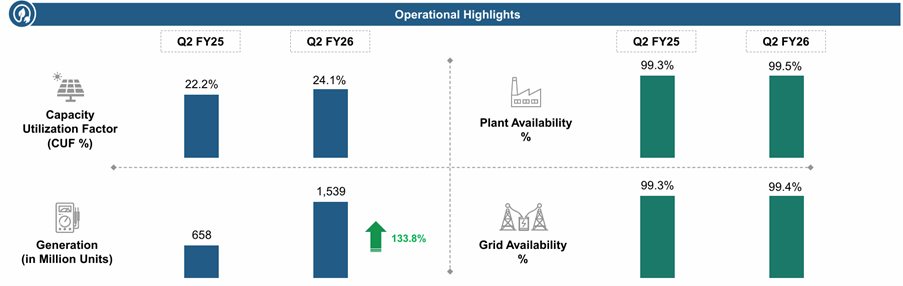 The company generated 1,539 million units of renewable energy in Q2 FY26, up 133.8% from Q2 FY25. This was driven by a higher capacity utilization factor (CUF) and new capacity additions. Rajasthan-based operational assets with 2,250 MW contracted capacity are reported to have delivered an average CUF of 25.8%.
