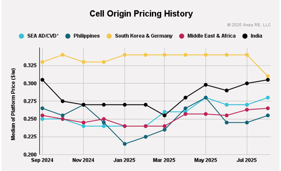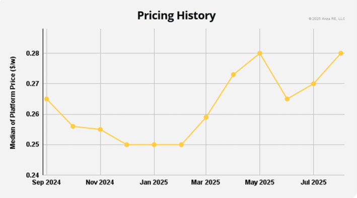 Solar module prices for distributed generation projects in the U.S. increased by 3.7% to $0.28/W in the third quarter (Q3) of 2025, according to Anza Renewables.
