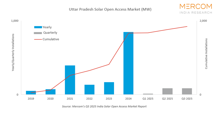 In the first nine months of 2025, Uttar Pradesh added 1,842.4 MW solar open access capacity, according to Mercom India’s Q3 2025 Solar Open Access Market Report.