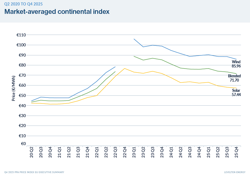 The blended European PPA price settled around €71.70 (~$84.96)/MWh. This downward pressure is primarily driven by low and frequently negative wholesale power prices, particularly in high-renewables markets such as Germany and Spain, where solar cannibalisation has significantly reduced capture prices.