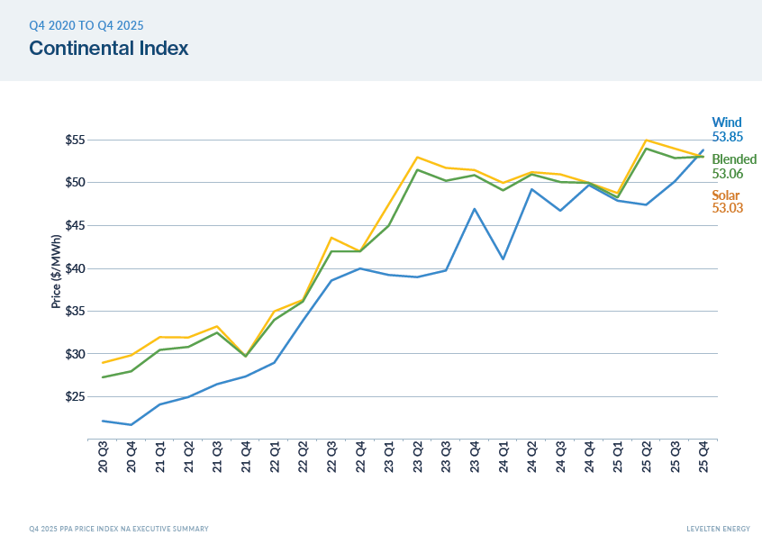 Wind prices showed more volatility, dipping QoQ slightly, but still stood at $53.85/MWh, up roughly 9% year-on-year, with a blended PPA price of $53.06/MWh.