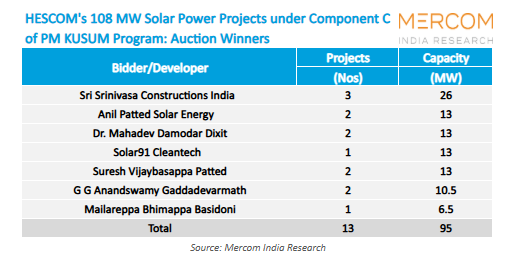 Seven companies have won Hubballi Electricity Supply Company’s (HESCOM) auction to commission 13 solar power projects totaling 95 MW in Karnataka under Component C of the Pradhan Mantri Kisan Urja Suraksha evam Utthaan Mahabhiyan (PM-KUSUM).