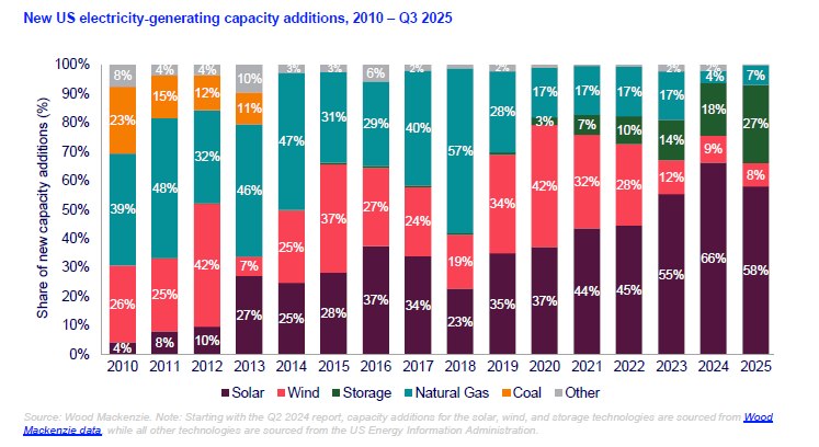 Solar accounted for 58% of all new electricity-generating capacity added in the U.S. in Q3 2025, with 30 GW added. Solar-plus-storage solutions accounted for 85% of new power-generating capacity added during the period.