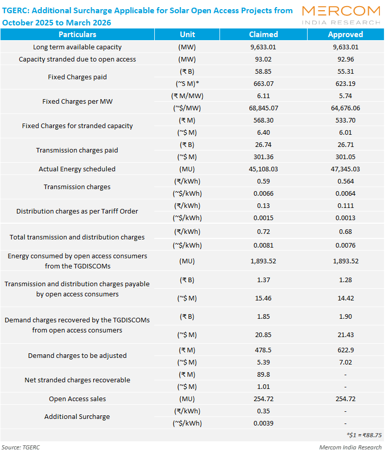 Previously, the Commission determined an additional tariff of ₹1.45 (~$0.016)/kWh in 1H FY 2026.