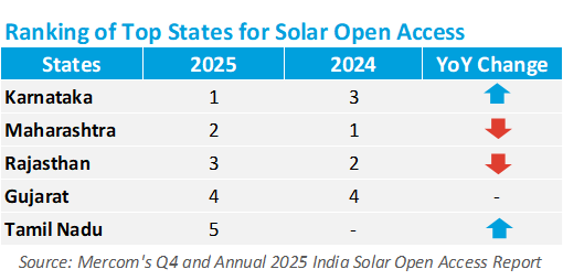 Karnataka, Maharashtra, Rajasthan, Gujarat, and Tamil Nadu led solar open access installations in 2025, contributing to slightly over 85% of the total.