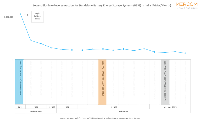In 2025, the lowest tariff for standalone BESS projects declined to ₹148,000 (~$1,611)/MW/month, a 35% drop from ₹225,985 (~$2,460)/MW/month in the previous year.